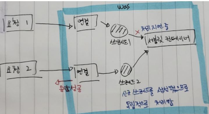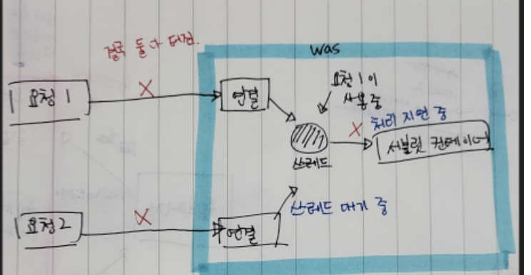 요청이 여러명이 왔을 때 쓰레드가 작업이 끝날 때 까지 기다려야 한다.