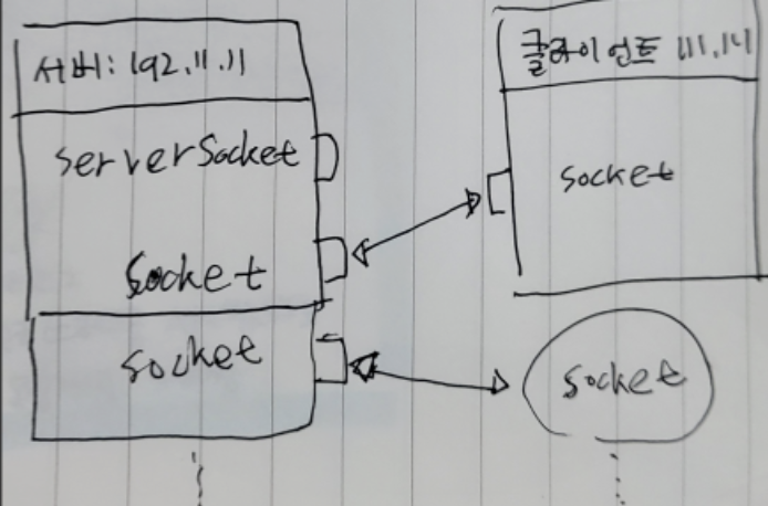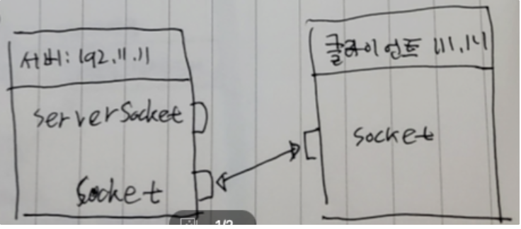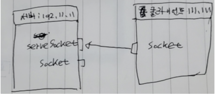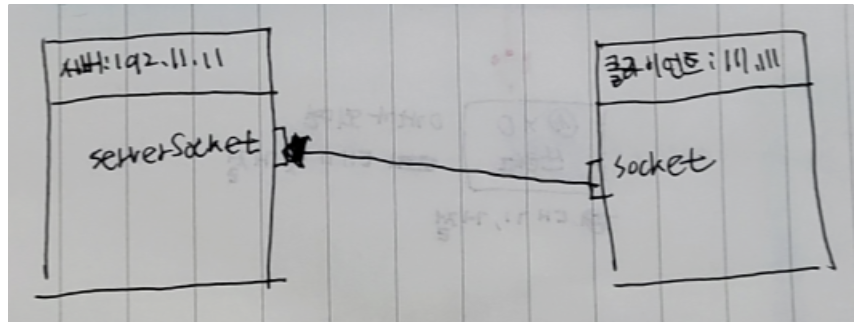 1. `Socket socket = new Socket(”111.111”, 8080);`- 서버 소켓은 클라이언트 프로그램의 연결 요청을 받고, 클라이언트와 연결할 소켓을 새로 생성한다.