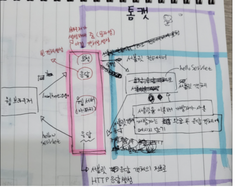 - 톰캣의 앞단에 있는 웹 서버는 요청과 응답 객체를 요청 별로(멀티 쓰레드 지원) 객체를 생성하여 서블릿 컨테이너에게 요청한다.