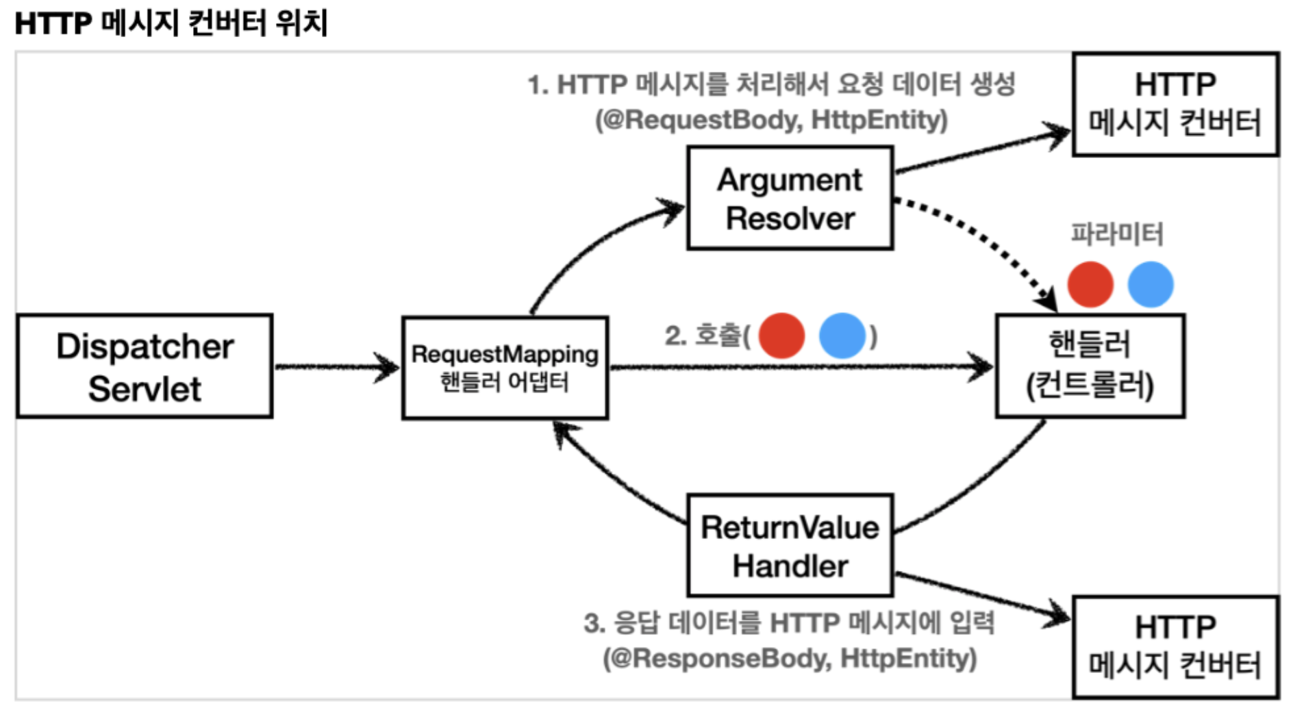 즉, 내부적으로 ArgumnetResolver와 ReturnValueHandler는 HTTP 메시지 컨버터를 호출하여