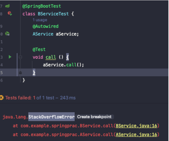 순환 참조를 하게되면 아래와 같이 StackOverflowError가 발생하게 된다.
