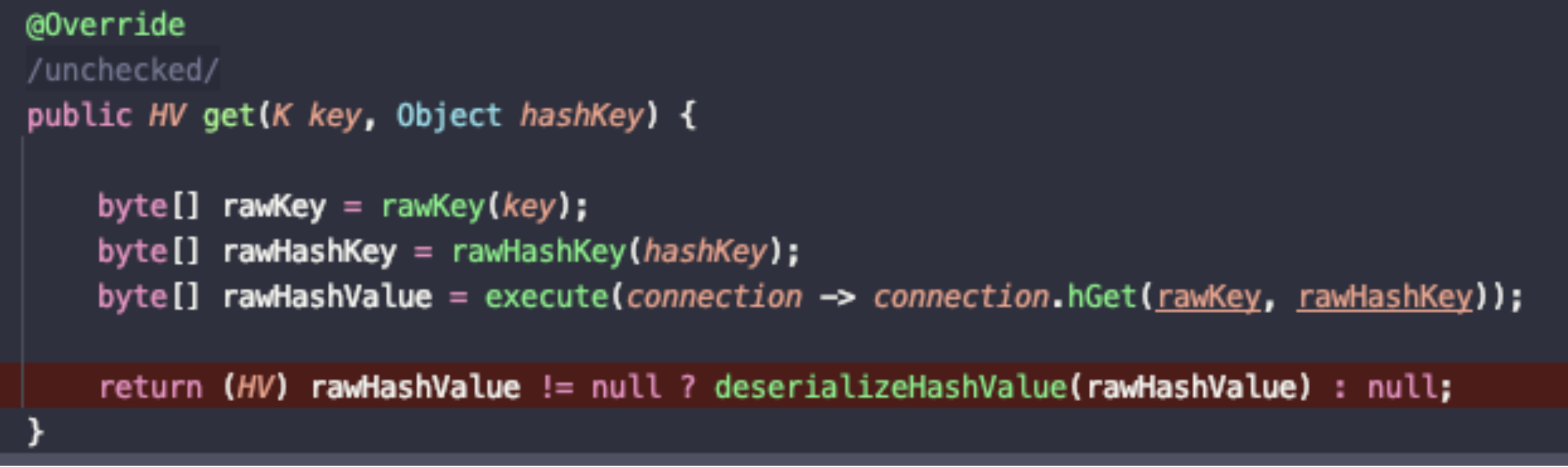 이 클래스는 HashOperations의 구현체이다. 조회하는 get()을 보면, null이 아닐 경우 deserializeHashValue()을 호출한다.