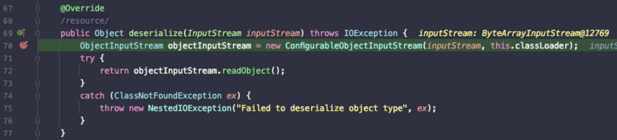 내부적으로 들어가다 보면, DefaultDeserializer가 나오는데 70번 째 라인에서 EOFException을 발생시킨다.