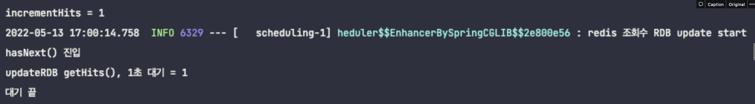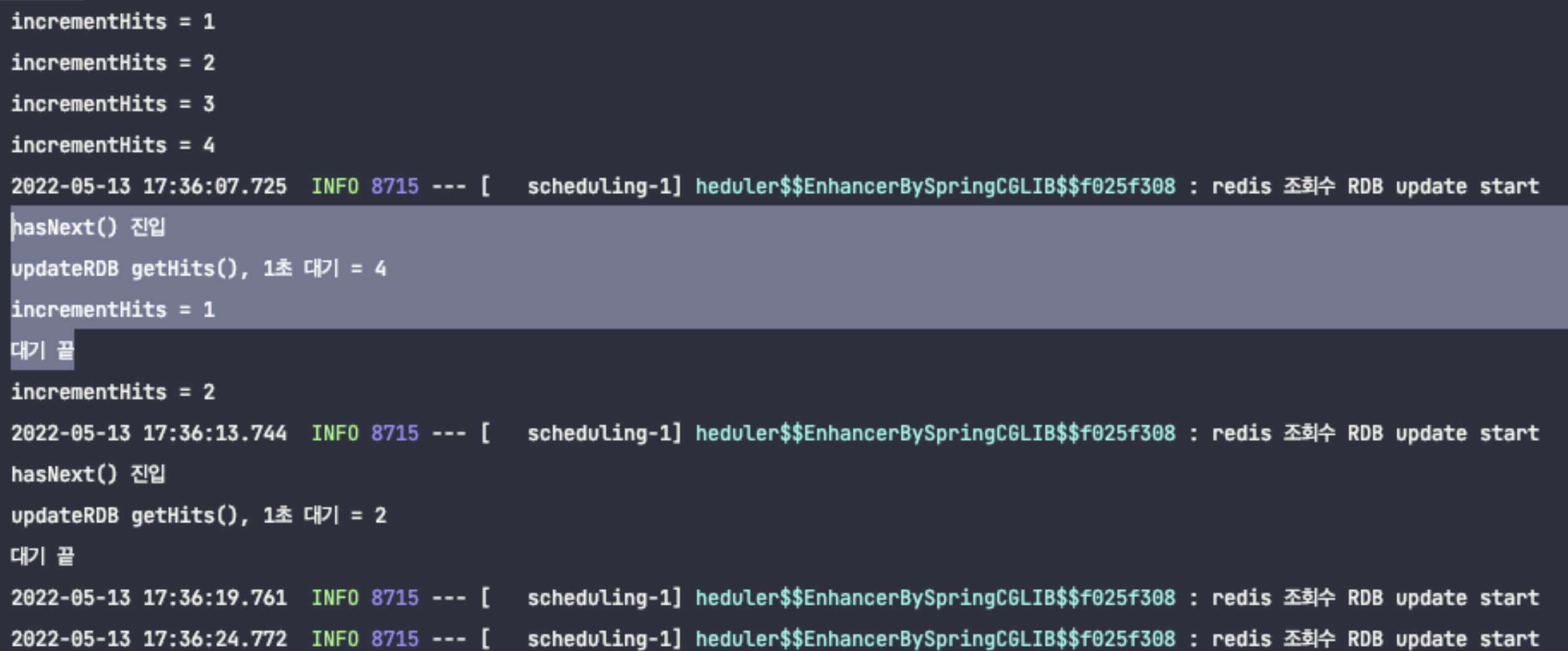 - updateRDB getHits(), 1초대 대기: updateRDB()가 실행되어 Redis에서 조회한 조회수이다.