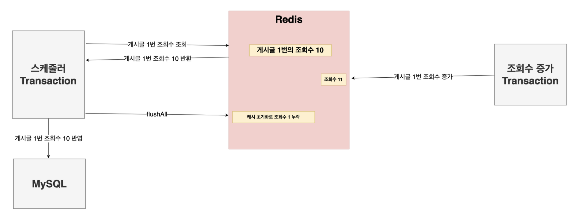- T2에 의해 Redis에 조회수는 11이 된다.