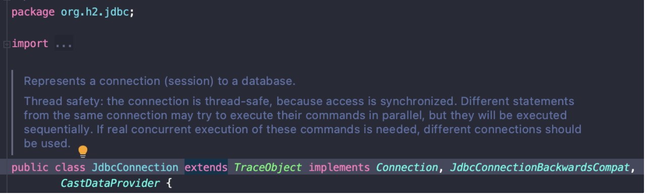 별개로 만약 h2 드라이버라면 h2는 아래 클래스로 드라이버를 제공한다. JDBC 인터페이스(java.sql.Connection)인 Connection을 구현한다.