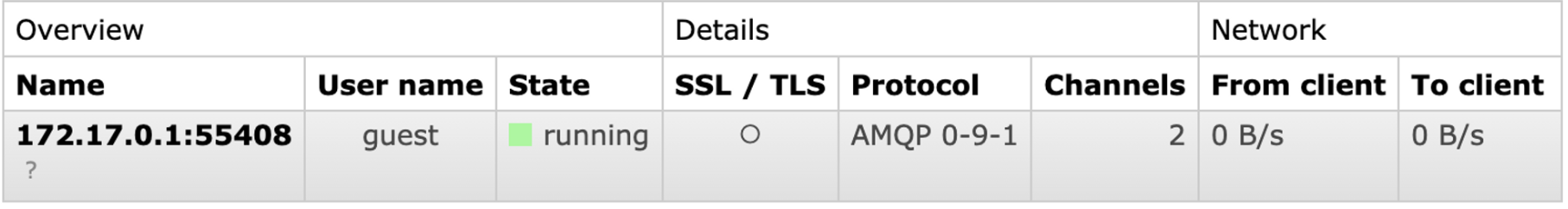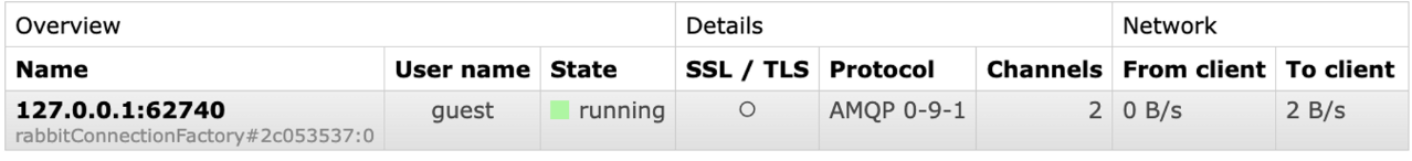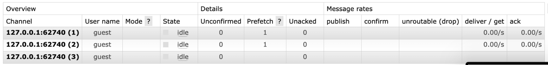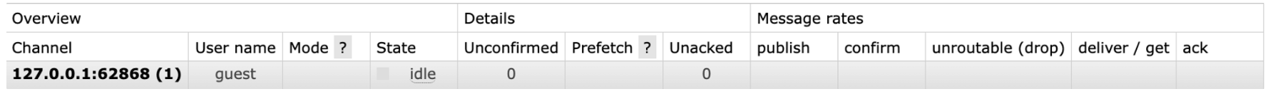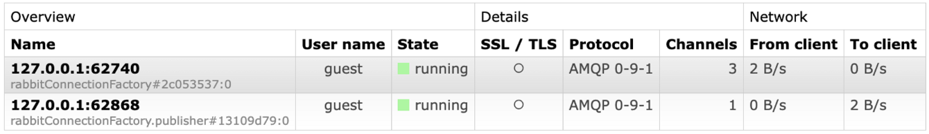 62740)์ channel(consume)์ด 1๊ฐ ์ถ๊ฐ๋๊ณ ,62868connection์ด ์๋ก ์๊ธฐ๋ฉด์ channel(publisher)์ด 1๊ฐ ์ถ๊ฐ๋์ด ์ด 4๊ฐ์ channels๊ฐ ๋๋ค.