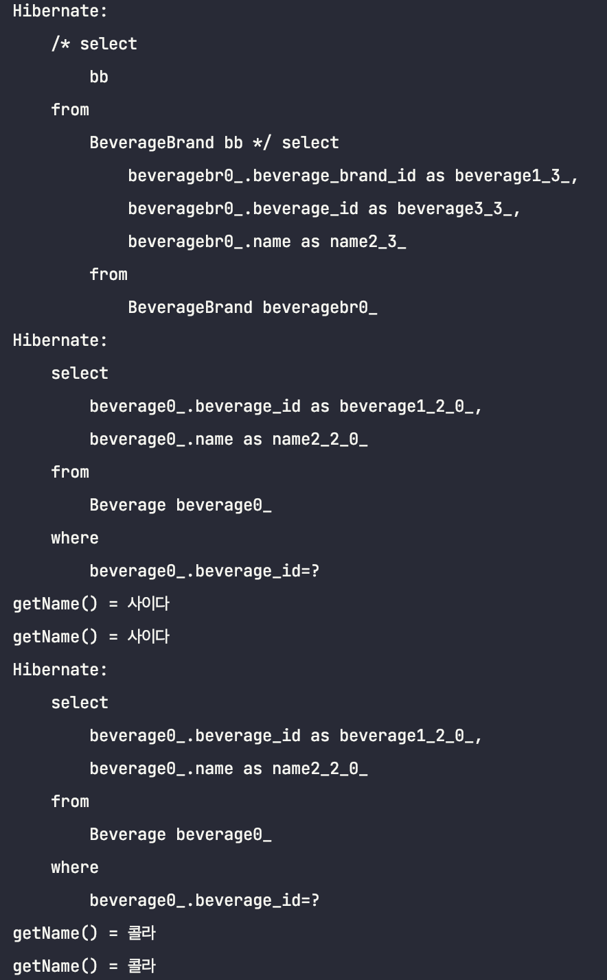 beverage 테이블과 조인된 쿼리가 나갔습니다. 클래스 정보를 봤을 때도 우리가 아는 일반적인 클래스 정보가 나왔습니다.