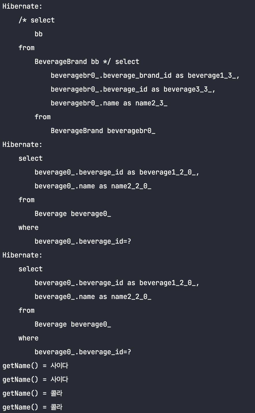 한방 쿼리가 아닌 BeverageBrand만 조회한 후, getName을 할 때 Beverage 조회 쿼리를 따로 날렸습니다.