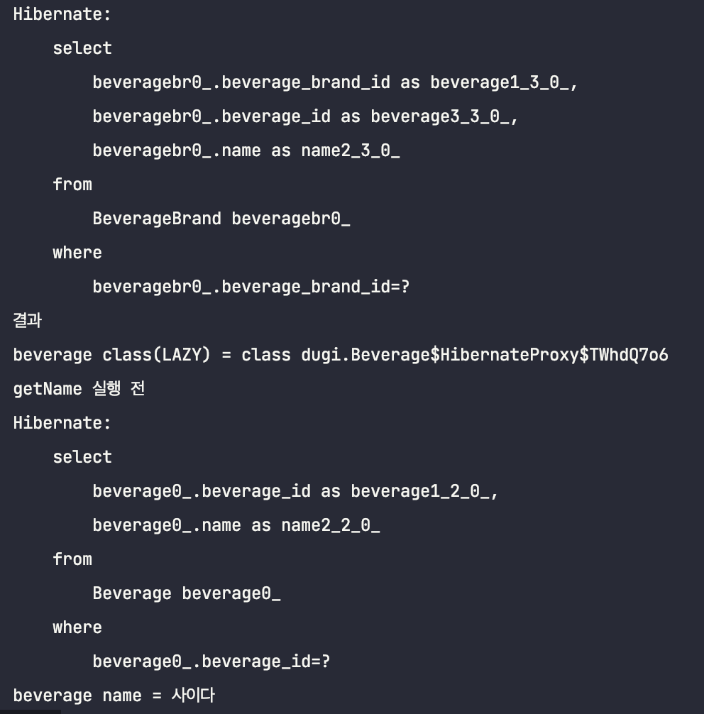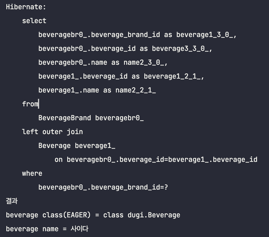 System.out.println("beverage class(EAGER) = " + beverageBrand.getBeverage().getClass());