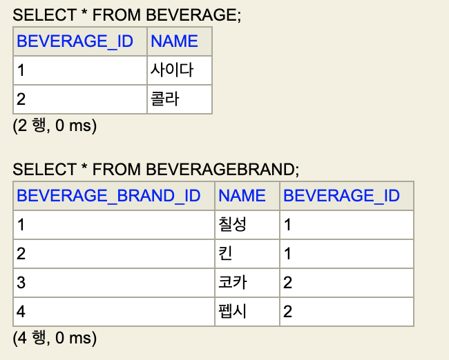 위에 DB에 저장된 데이터를 한 번 다시 확인 하시면 BeverageBrand의 beverage_id가 사이다, 콜라로 총 두개가 존재 합니다.